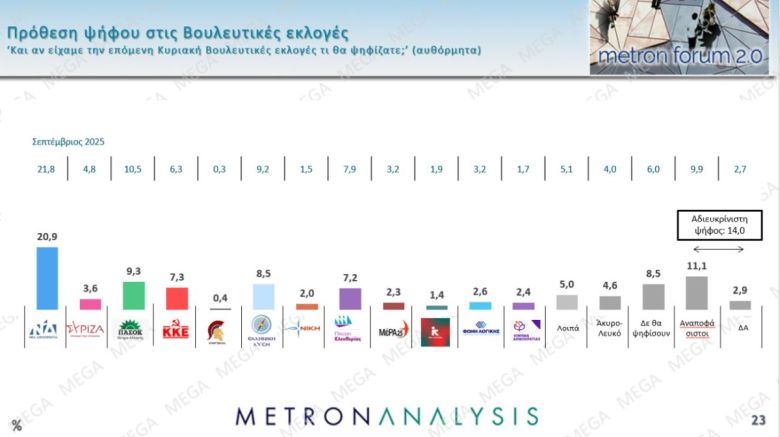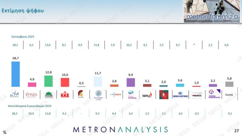 Η ΝΔ συγκεντρώνει 28,7%, το ΠΑΣΟΚ 12,8%, η Ελληνική Λύση 11,7%, το ΚΚΕ 10%, η Πλεύση Ελευθερίας 9,9%, ο ΣΥΡΙΖΑ 4,9%, η Φωνή Λογικής 3,6%, το Κίνημα Δημοκρατίας 3,2%, το ΜεΡΑ25 3,1%.