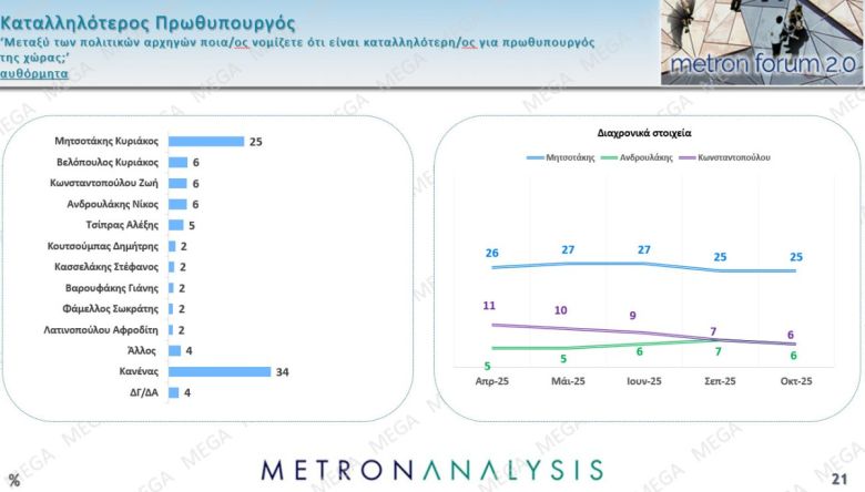 Όσο συζητείται στη δημόσια σφαίρα το ενδεχόμενο δημιουργίας κόμματος από τον Αλέξη Τσίπρα τόσο καταγράφεται στις συνειδήσεις ότι ο Αλέξης Τσίπρας είναι πολιτικός αρχηγός και αυθόρμητα μπαίνει στις απαντήσεις της καταλληλότητας για πρωθυπουργός φθάνοντας τα ποσοστά των άλλων αρχηγών της αντιπολίτευσης που ηγούνται κομμάτων. Ο «Κανένας» έχει παγιωθεί ως καταλληλότερος με 34% με τον Κυριάκο Μητσοτάκη να ακολουθεί στο 25%. Από 6% συγκεντρώνουν Νίκος Ανδρουλάκης, Ζωή Κωνσταντοπούλου και Κυριάκος Βελόπουλος. Ο Αλέξης Τσίπρας φθάνει το 5%.