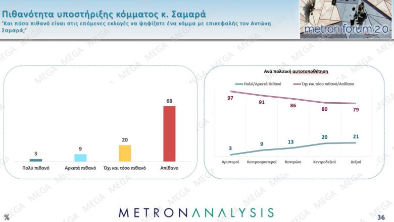 Χαμηλότερη από το κόμμα Τσίπρα είναι η πιθανότητα για στήριξη ενός κόμματος του κ. Σαμαρά αλλά αν δημιουργηθεί θα επηρεάσει το πολιτικό σκηνικό. Πολύ πιθανό και πιθανό να το ψηφίσει είναι το 12% με την κύρια δεξαμενή δυνητικών ψηφοφόρων να κινείται στο δεξιό φάσμα. Δύο στους δέκα δεξιούς (21%), και κεντροδεξιούς (20%) θα το ψήφιζαν ενώ από το κέντρο το ποσοστό φθάνει το 13%.