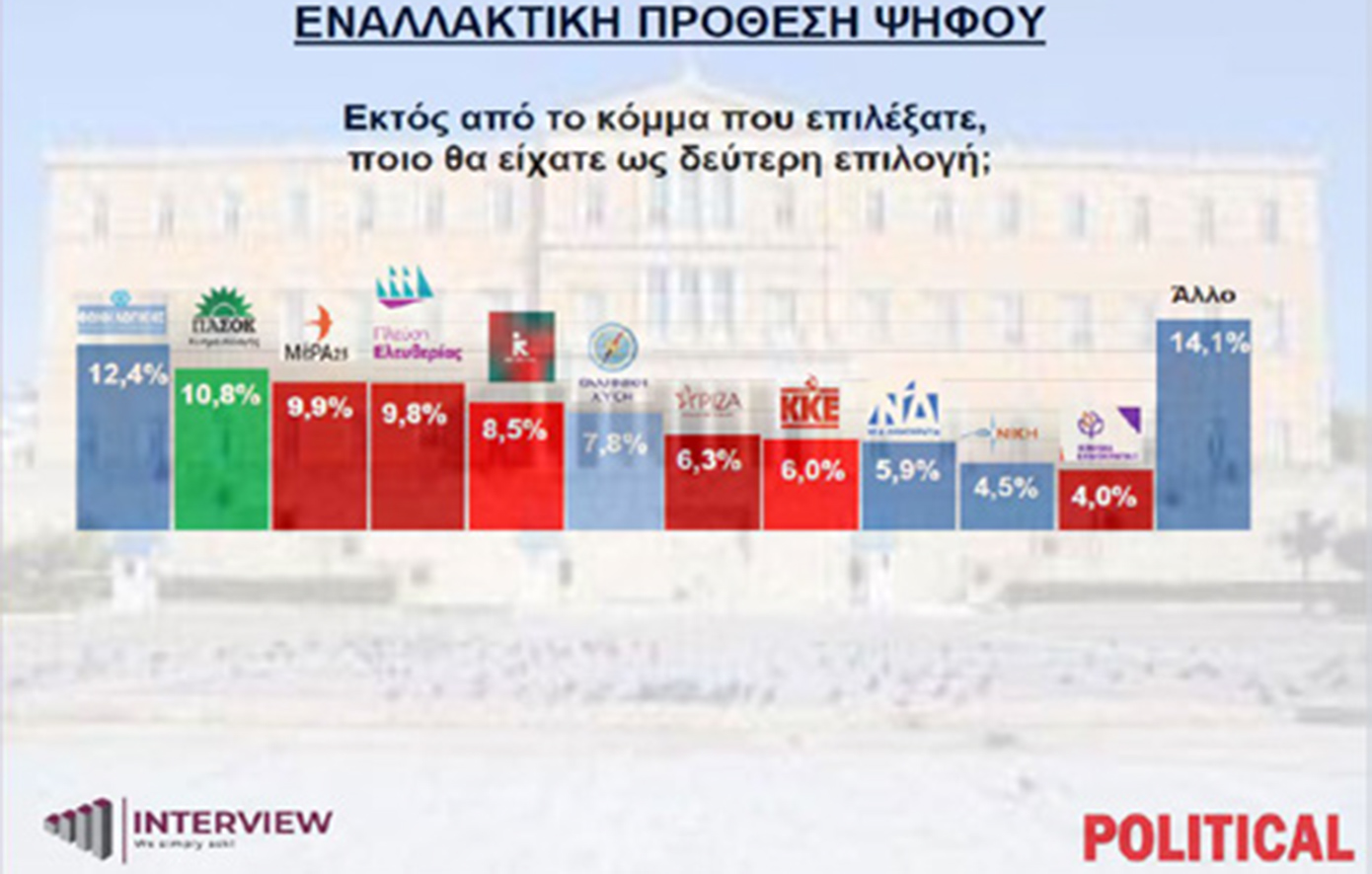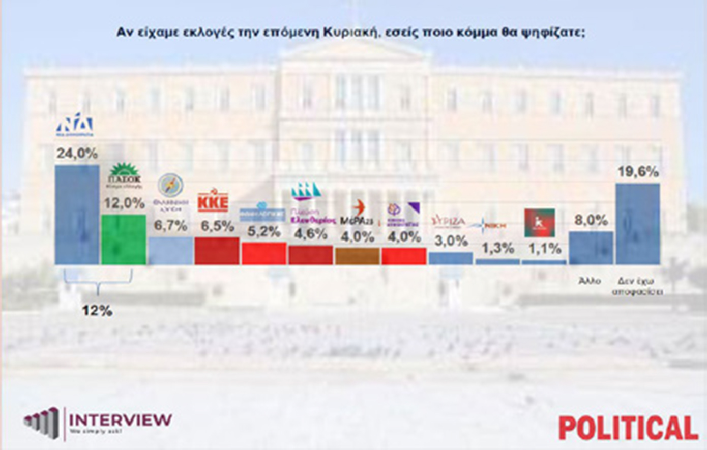 Πρώτο κόμμα και με διαφορά παραμένει η ΝΔ σε νέα δημοσκόπηση, με το ΠΑΣΟΚ να έχει μία μικρή άνοδο, σύμφωνα με την έρευνα της Interview, για την εφημερίδα «Political».