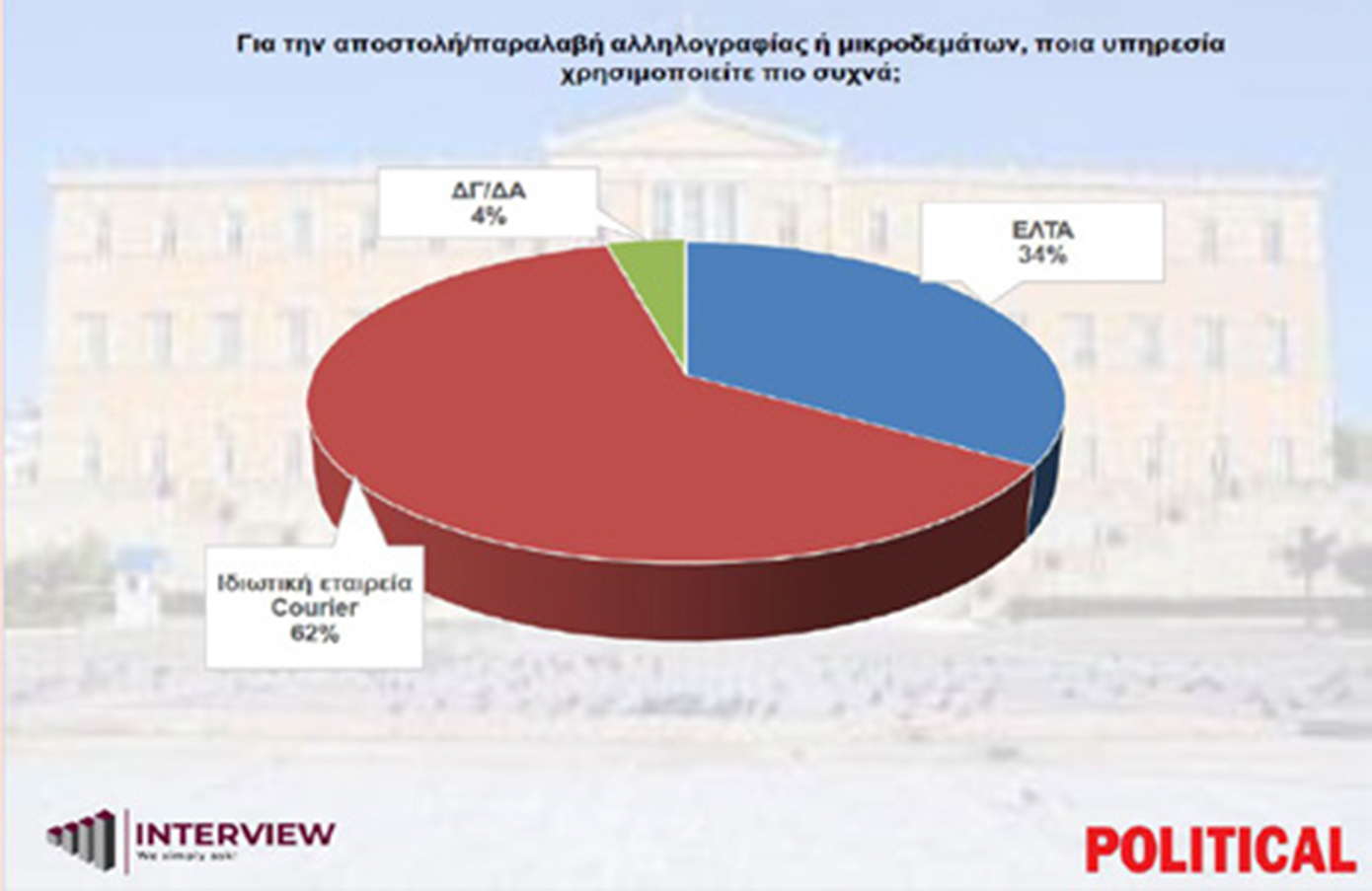 Τέλος, στη δημοσκόπηση έγινε ερώτηση και για την υπόθεση των ΕΛΤΑ με το 62% να απαντά ότι προτιμά τις ιδιωτικές εταιρείες courier για αποστολή/παραλαβή αλληλογραφίας ή μικροδεμάτων, έναντι 34% που επιλέγει τα ΕΛΤΑ και 4% που απαντά ΔΞ/ΔΑ.