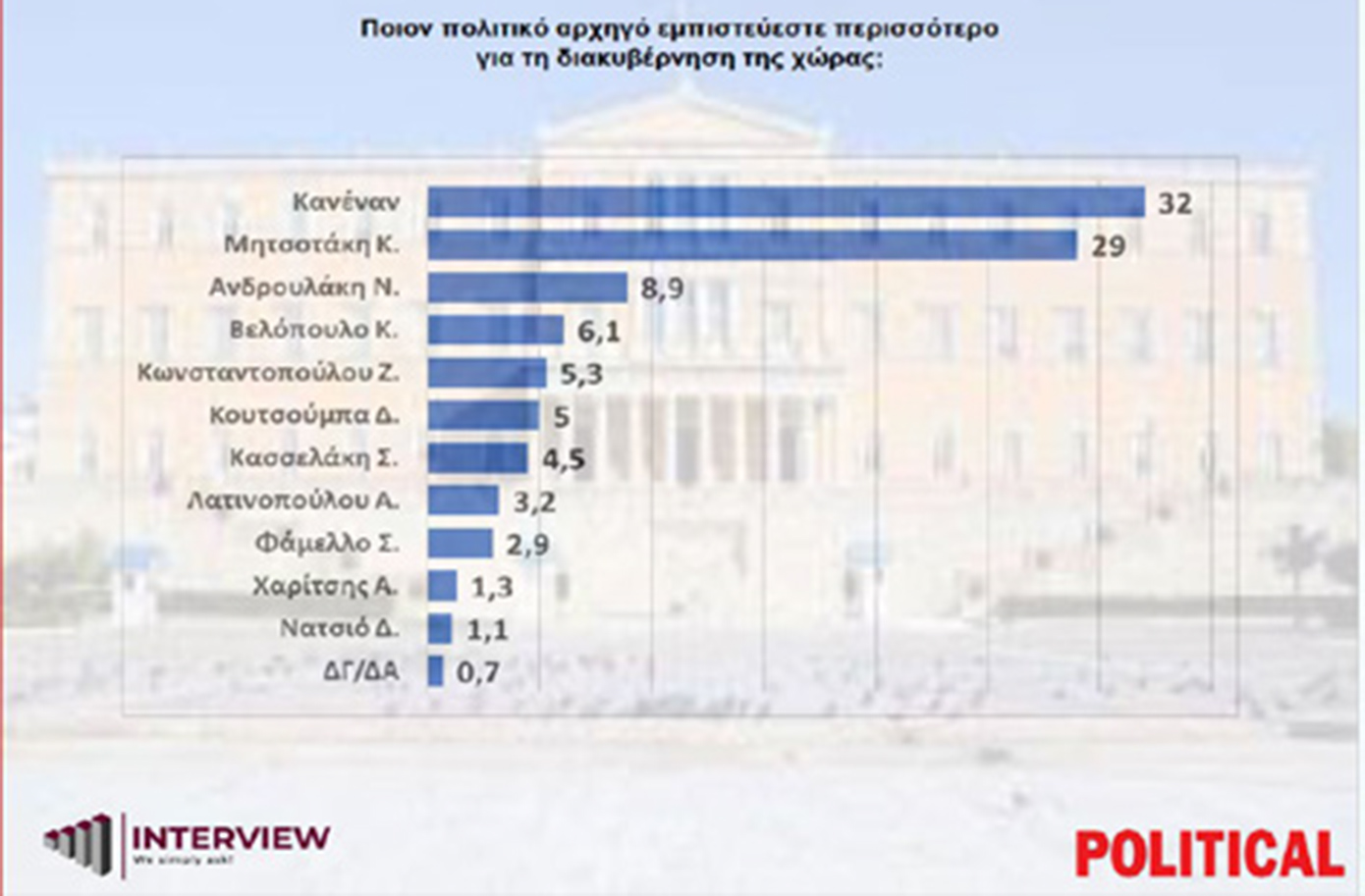 Ο Κυριάκος Μητσοτάκης στην ερώτηση ποιον πολιτικό εμπιστεύεστε πιο πολύ για τη διακυβέρνηση της χώρας συγκεντρώνει ποσοστό 29%. Στην πρώτη θέση παραμένει ο «Κανένας» με ποσοστό 32%, και ακολουθούν ο Ν. Ανδρουλάκης με 8,9%, ο Κυριάκος Βελόπουλος με 6,1%, η Ζωή Κωνσταντοπούλου με 5,3%, ο Δημήτρης Κουτσούμπας με 5%, ο Στέφανος Κασσελάκης με 4,5%, η Αφροδίτη Λατινοπούλου με 3,2%, ο Σωκράτης Φάμελλος με 2,9%.