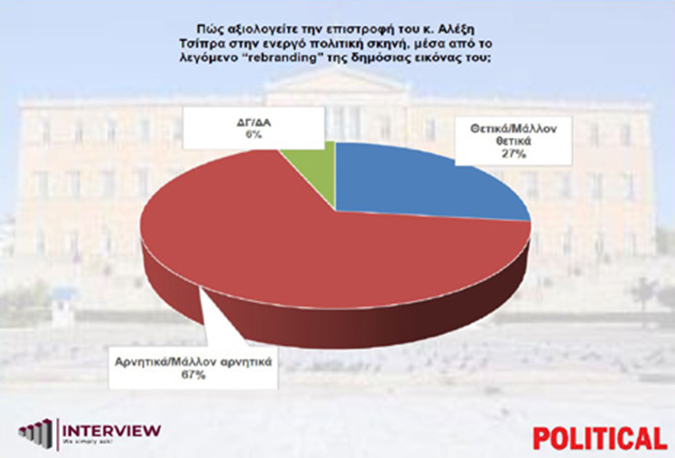 Αναφορικά με την επιστροφή του Αλέξη Τσίπρα στην πολιτική, το 29% τη βλέπει θετικά/μάλλον θετικά, το 67% αρνητικά/μάλλον αρνητικά και το 6% ΔΞ/ΔΑ.