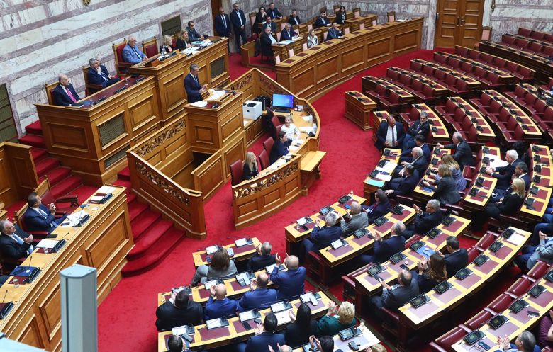 «Να σας συγχαρώ για την εφαρμογή του περιορισμού του χρόνου για τους ομιλητές», ανέφερε ο Κυριάκος Μητσοτάκης ανεβαίνοντας στο βήμα της Βουλής, απευθυνόμενος στον πρόεδρο της Βουλής Νικήτα Κακλαμάνη.