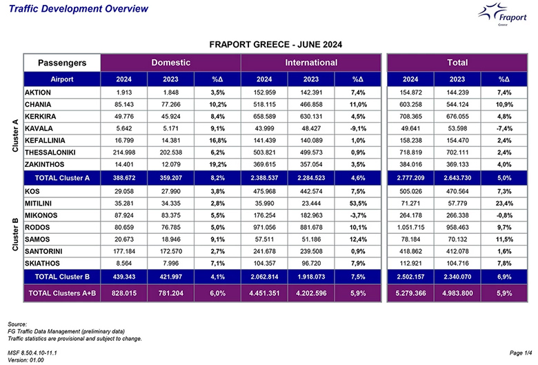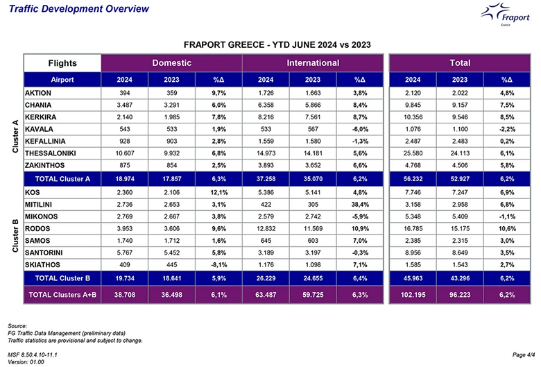 Ενδεικτικά, τον Ιούνιο του 2024 μέσω των 14 περιφερειακών αεροδρομίων, διακινήθηκαν συνολικά 5.279.366 επιβάτες, έναντι 4.983.800 πέρυσι, σημειώνοντας άνοδο 5,9%. Οι διεθνείς πτήσεις σημείωσαν αύξηση 5,9% που μεταφράζεται σε 4.451.351 επιβάτες, ενώ οι εσωτερικές πτήσεις αυξήθηκαν κατά 6%, δηλαδή 828.015 επιβάτες.