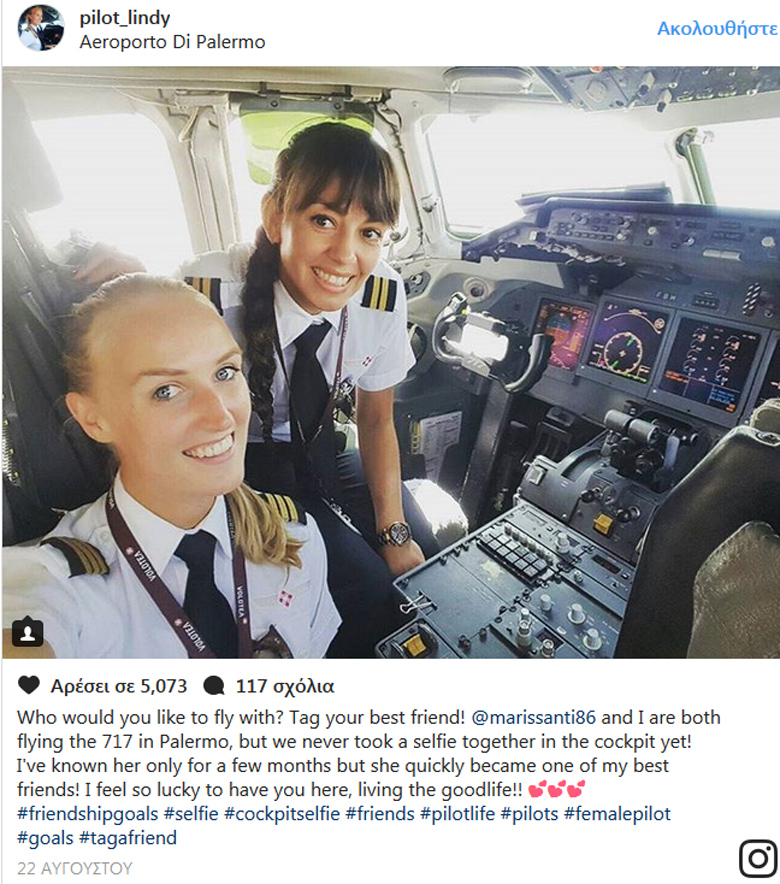 Η 24χρονη Lindy Mariëlle Kats, με περηφάνια ποζάρει μπροστά από την κάμερα του κινητού της σε κάθε ευκαιρία όταν βρίσκεται εντός του κόκπιτ ή σε κάποιο εξωτικό προορισμό. Με πάνω από 80.000 followers στο Instagram η ξανθιά κυβερνήτης από το Άμστερνταμ όταν δεν πιλοτάρει το Boeing 717, ανοίγει φτερά για μέρη που σχεδόν όλοι θέλουν να βρεθούν, όπως η Νέα Υόρκη, το Ντουμπάι αλλά και λιγότερο μακρινά με εμάς μέρη, όπως η Ιταλία όπου και μένει.